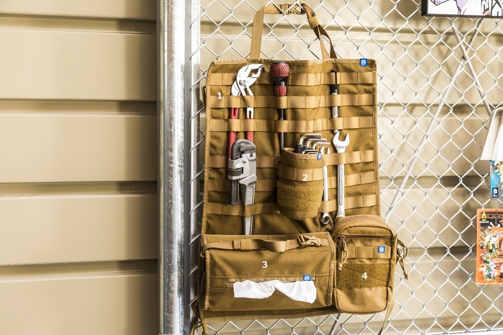 本来はシートの後ろなどに装着するシートバックオーガナイザーは、豊富なモールシステム対応グッズを組み合わせることでシステムアップ可能。こうやってガレージで使うなど、アイデア次第で使い方は無限大。