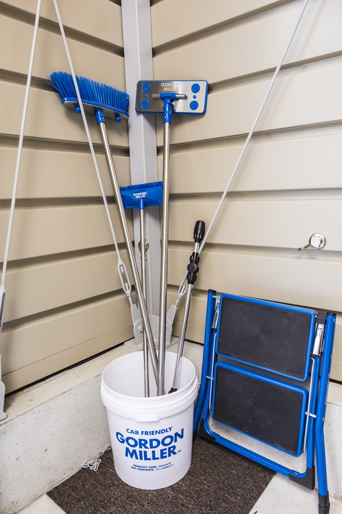 洗車道具だけでなく、デッキブラシやフローリングモップなど、ガレージ内の清掃にも便利なアイテム。高圧ジェットノズルは洗車だけでなく幅広く使えて便利。