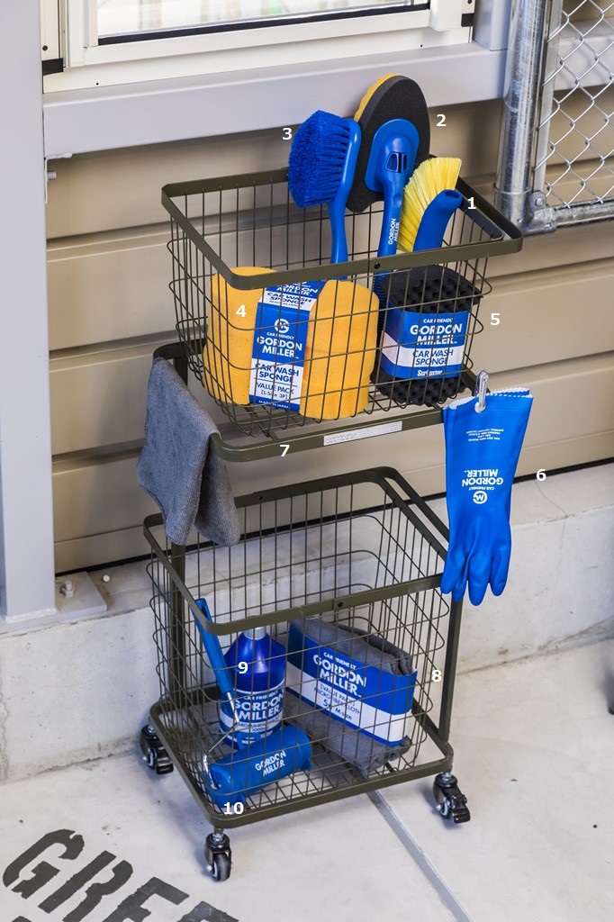 洗車道具は消耗品も含めて豊富にラインナップされているので、困ることはない。濡れた洗車道具を収納しておくのに、通気性が良くキャスター付きで移動も楽なバスケットワゴンはかなり重宝する。