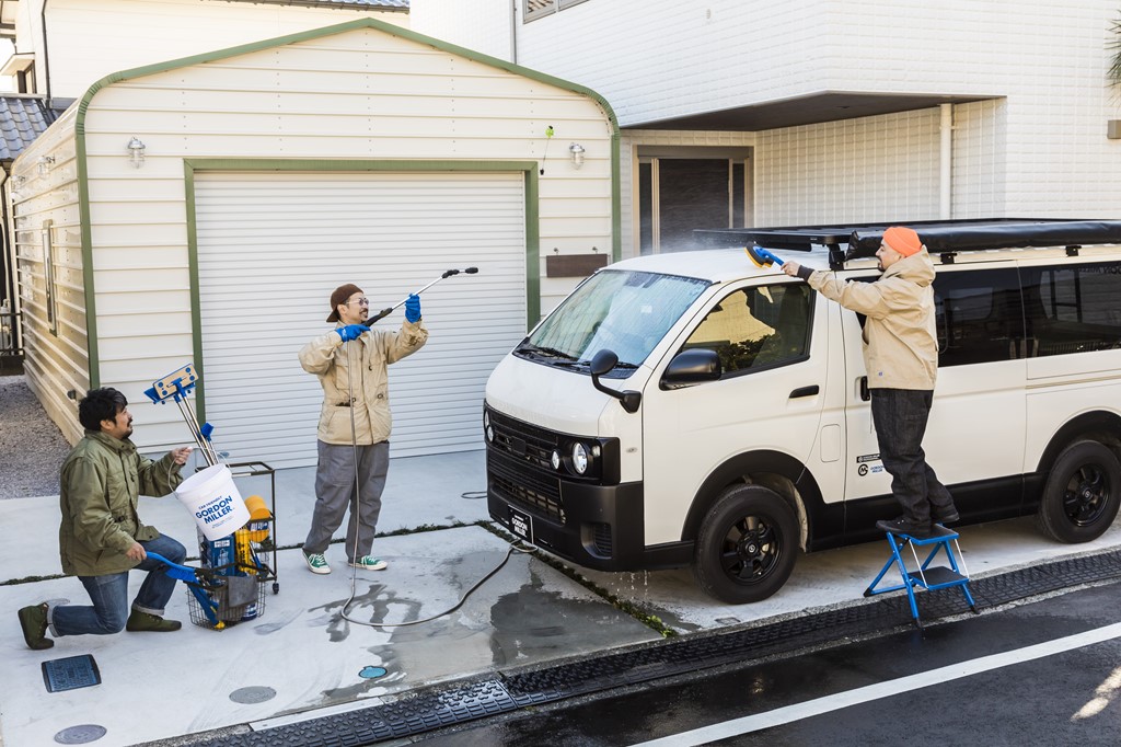 中でも特にオススメしたいのが、オリジナルの高圧ロングノズルだ。手元で水流のON/OFFができるのはもちろん、ハイエースのような背の高い車両でもルーフに簡単に水を掛けられるように先端の角度を調整可能。さらに一般家庭の水道水圧でも驚くほどの強力ジェットで汚れを落としてくれるのだ。