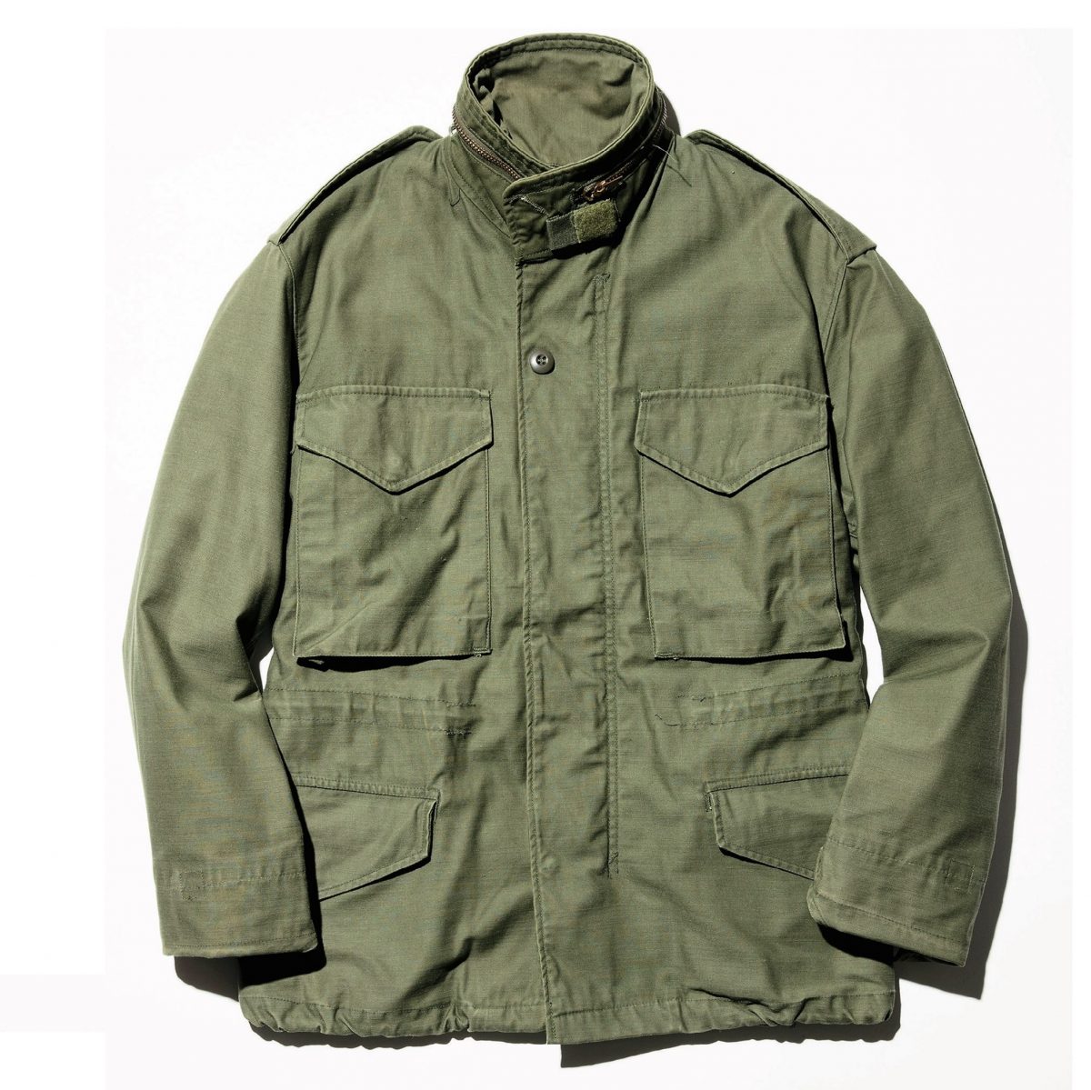 第2次世界大戦中の1943年に登場したフィールドジャケットM-43。ここに数々の仕様変更が加わり、1965年に完成したのが「M-65」だ。ボタンフロントはジップで開閉する仕様になり、ボタンで脱着していたフードは襟に内蔵。さらには手の甲を保護する折り返しの追加など、隅々まで計算尽くし。実は最初期型にはエポーレットがなく、ロバート・デ・ニーロが映画『タクシードライバー』で着用したエポーレット付きのM-65は2ndモデル。2nd モデルまでは手間のかかる作り方をしていたクラウン社製のアルミジップが付いていたが、3rdからは生産性を上げる目的でブラスジップに変更。その意味でも、2ndは人気が高い。