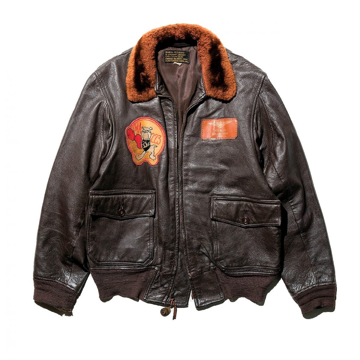 米陸軍航空隊のA-2と双璧をなす、米海軍のG-1。最初にG-1の名で呼ばれたのは’50年代に開発されたスペックナンバー「55J14」だが、その基本デザインは1940 年に採用された「M-422」を継承。陸軍航空隊(後の空軍)のA-2 が馬革であるのに対し、海軍のG-1 には柔らかい山羊革(ゴートスキン)が使われている。背中にはアクションプリーツが装備され、非常に機能的。1976 年に採用中止となるが、パイロットたちの強い要望により1984 年に再び採用されて現在に至る。古着でも比較的多くみられるため、愛好家も多く、バイク乗りにも人気が高い。