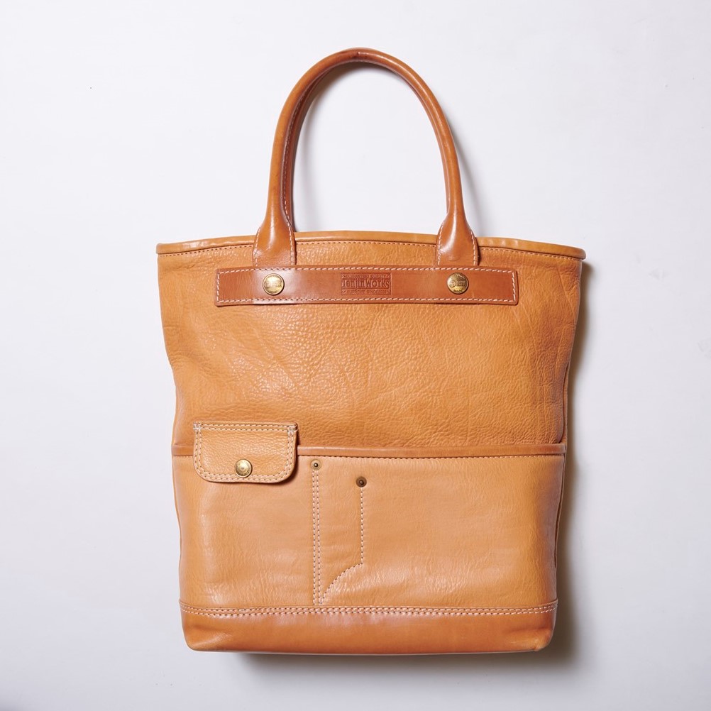 サイドにポケットが付き、使い勝手のいいレザートートバッグ。ボディにはソフトな国産地生、底面にはヘビータンニングレザーを使用した。女性にもおすすめ。7万5900円(カラー別途)