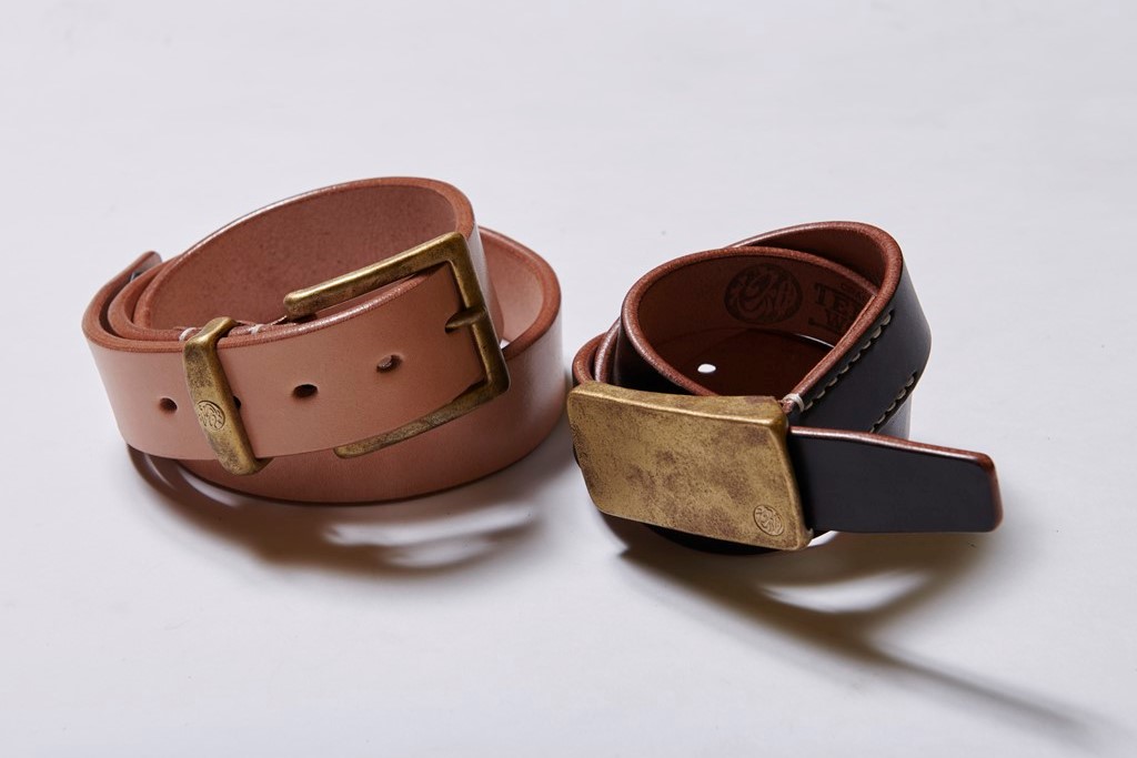 レザーベルトも天神ワークスの人気アイテム。ともに5㎜の極厚レザーにブラス製バックルを装着し存在感も抜群。(左)BE303(右)BE302ともに1万8700円(カラー別途)