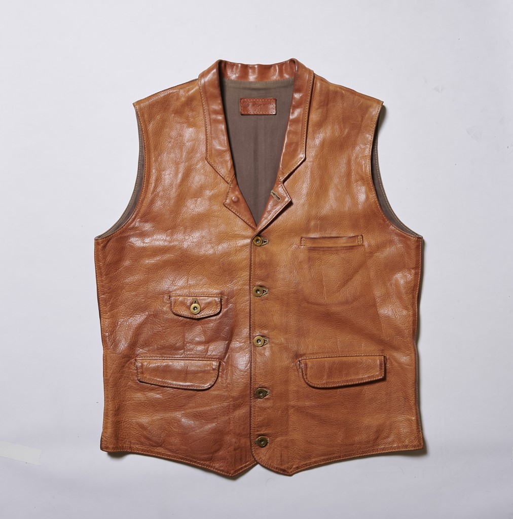 日本有数のタンナー、栃木レザーで鞣したヌメ革を採用したクラシカルなデザインのベスト。着込むほどに、写真のような美しいエイジングを見せる。11万2200円(カラー別途)