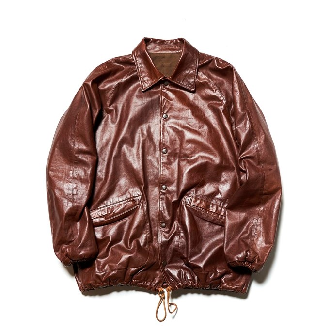 ‘70s〜’90sにあった数々のドリズラーライプのジャケットから着想を得て、0.7㎜に漉いた渋鞣しのキップレザーで仕上げたポロック。オリジナル同様、裾はゴム入りの仕様でフィット感を高めている。ポロックとは、“アクションペインティング” で有名なジャクソン・ポロックから拝借。17万5000円(カラー別途)