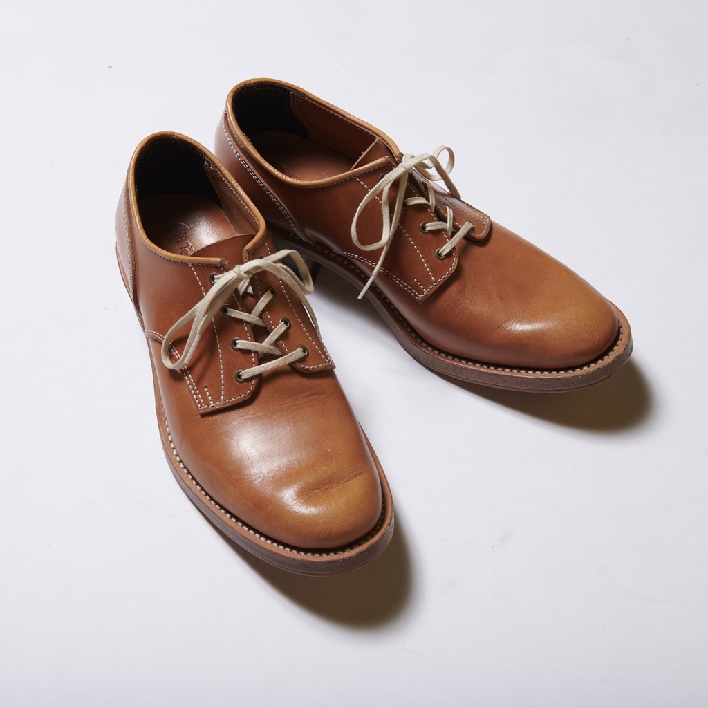 堅牢でベーシックなオックスフォードをイメージした意欲作。日本人の足型に合わせた美しいナローラインのオリジナルラストを採用した。2㎜厚のヘビータンニングレザーで、履き込むほどに風合いが増す。7万4800円(カラー別途)