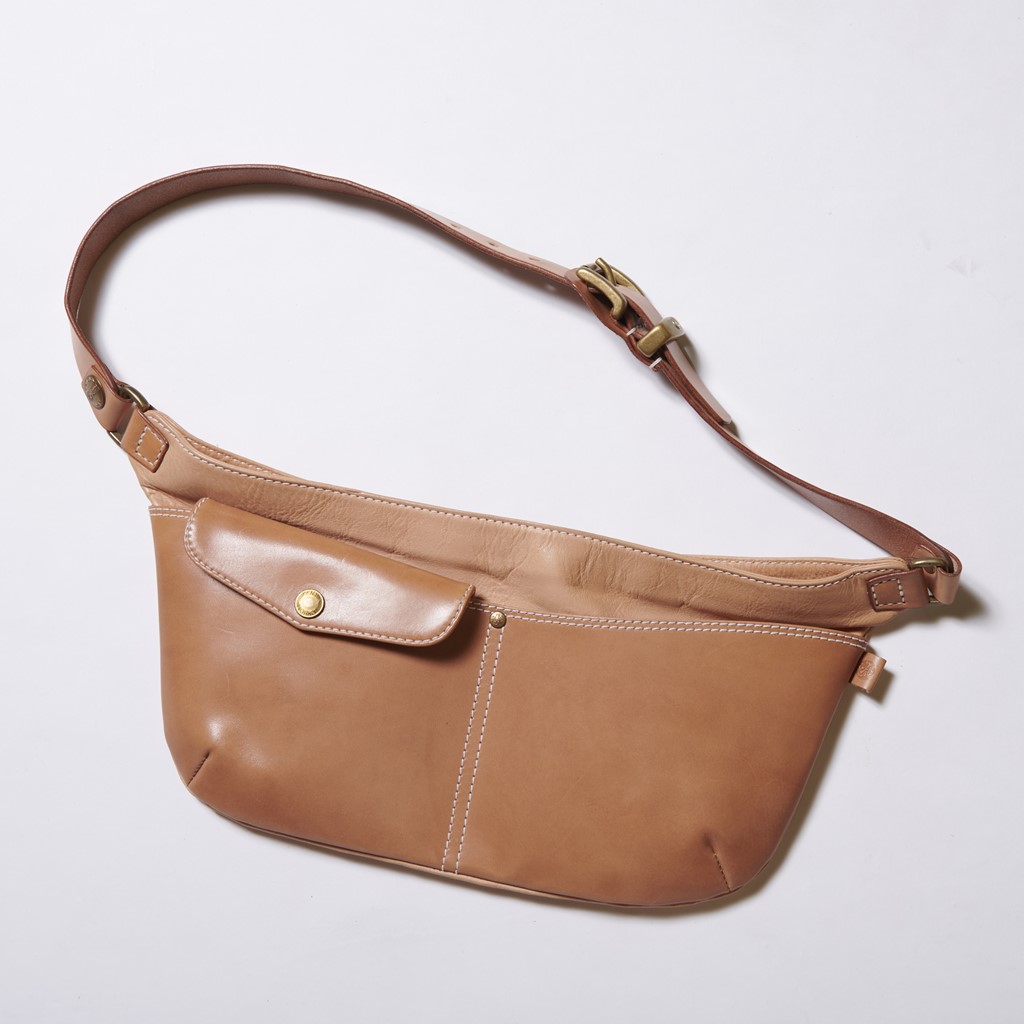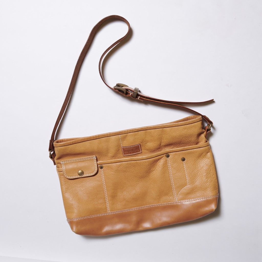 A4サイズがすっぽり収まる便利なショルダーポーチ。フロントデザインが’40年代のワークウエアのディテールを彷彿させる。柔らかい国産地生の革を使用。7万5900円(カラー別途)