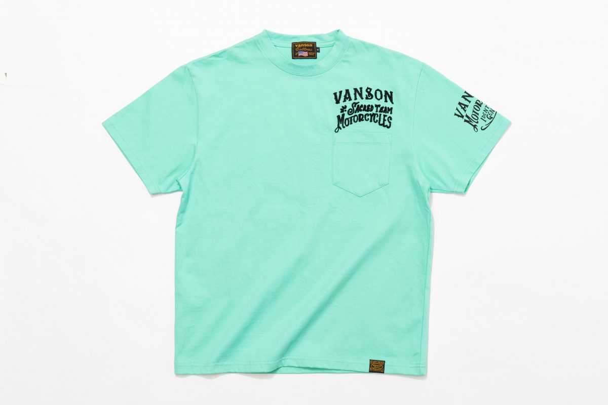 フライングウィールとヴィンテージ風フォントでロゴやデザインを描いたポケ付き天竺半袖Tシャツ。襟、袖、肩、裾などはチェーン刺繍で見た目のアクセントに加えて耐久性もプラス。7900円