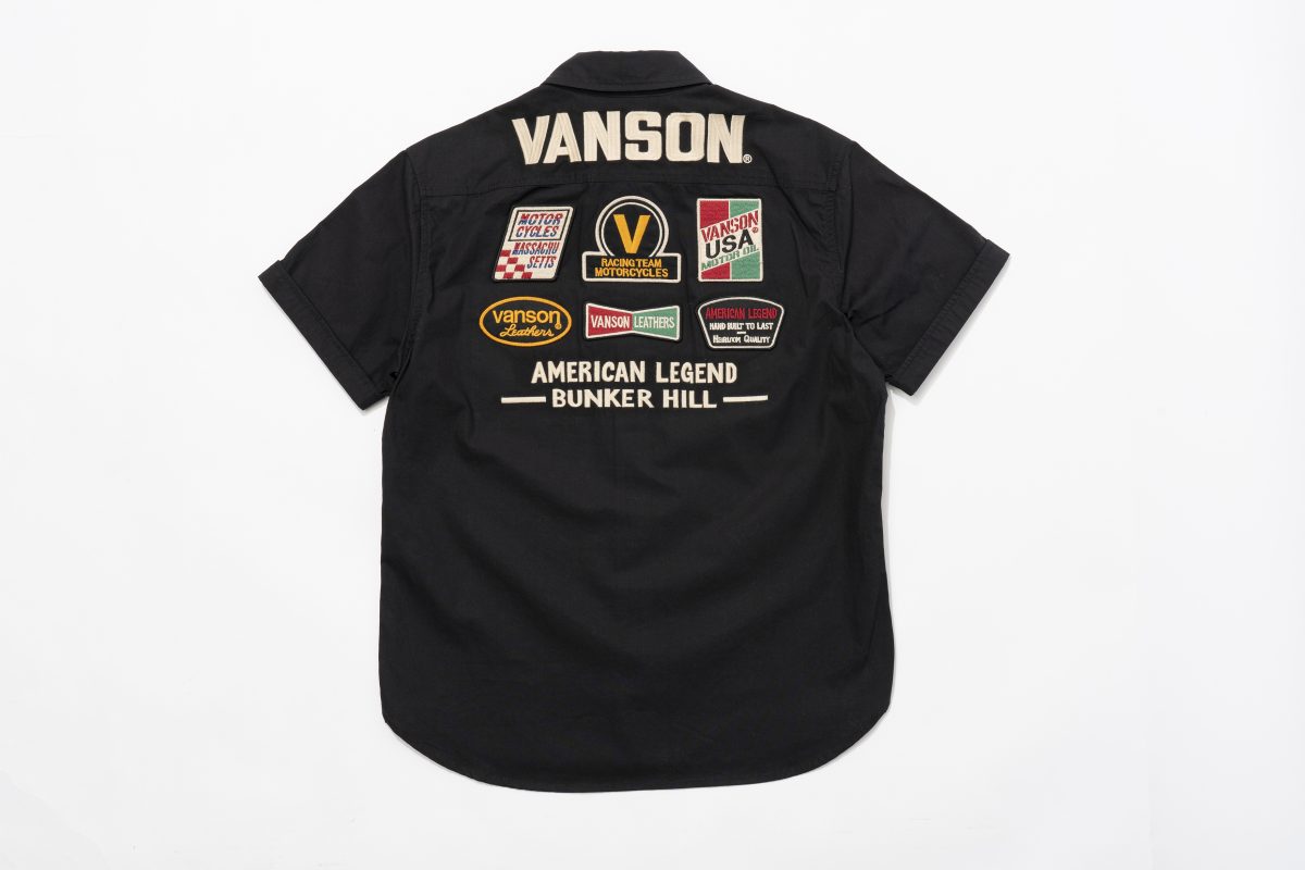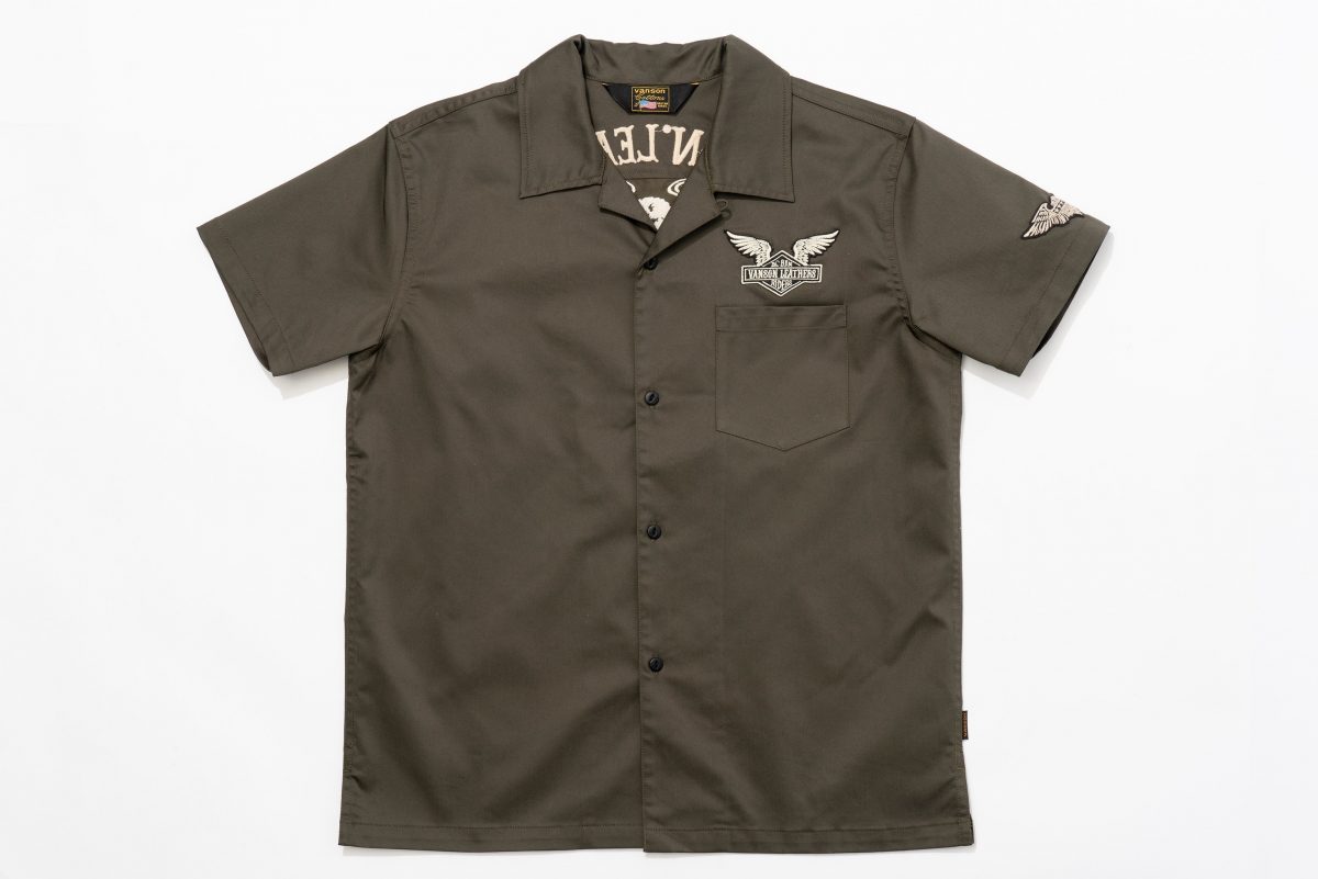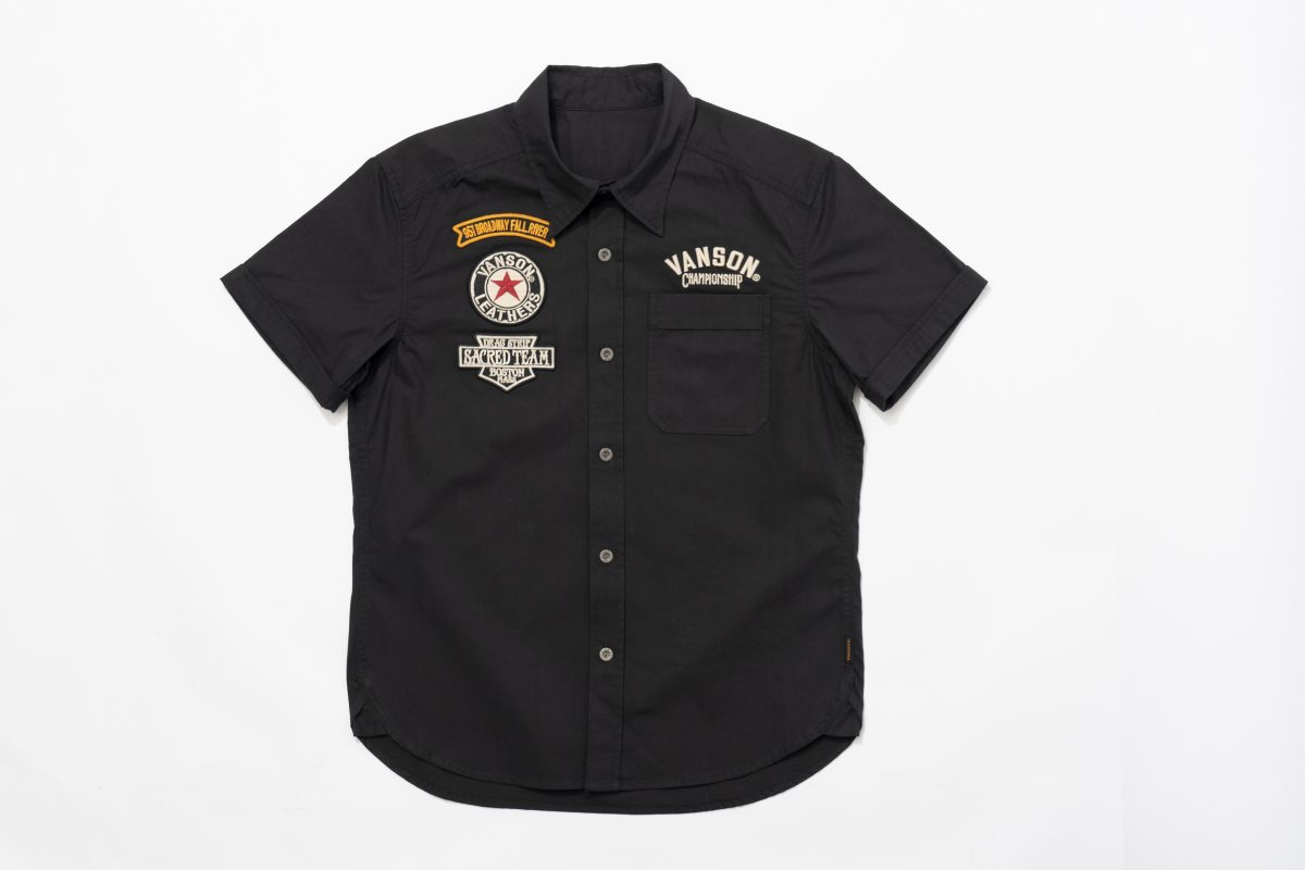 バンソンお馴染みのロゴマークからモーターサイクルシーンを連想させるオリジナルワッペンを背中、胸にもあしらったピットクルー風のワークシャツ。胸と背中の文字はこだわりの刺繍。1万3800円