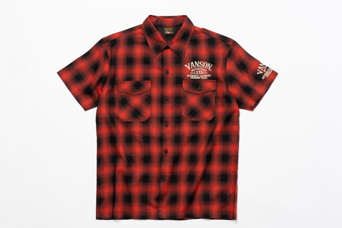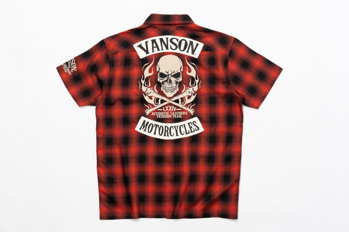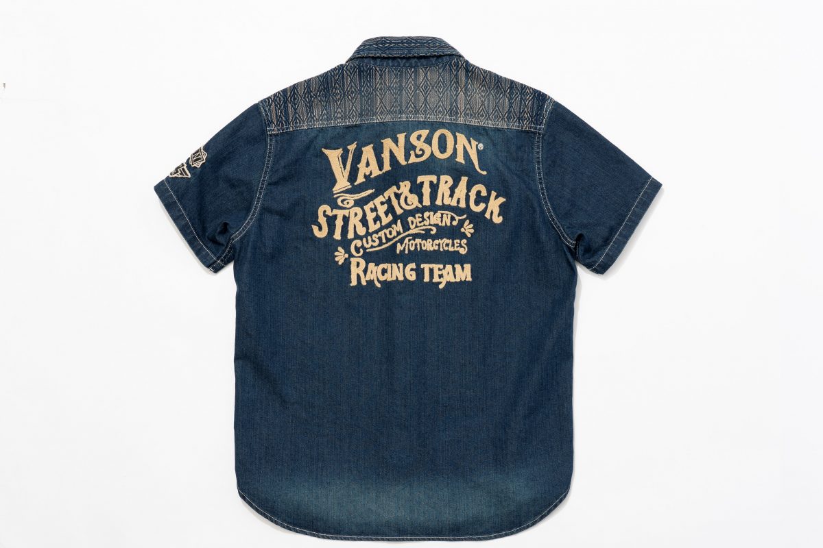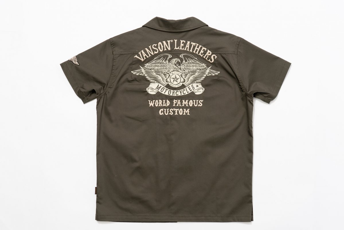 バンソンお馴染みのロゴマークからモーターサイクルシーンを連想させるオリジナルワッペンを背中、胸にもあしらったピットクルー風のワークシャツ。胸と背中の文字はこだわりの刺繍。1万3800円