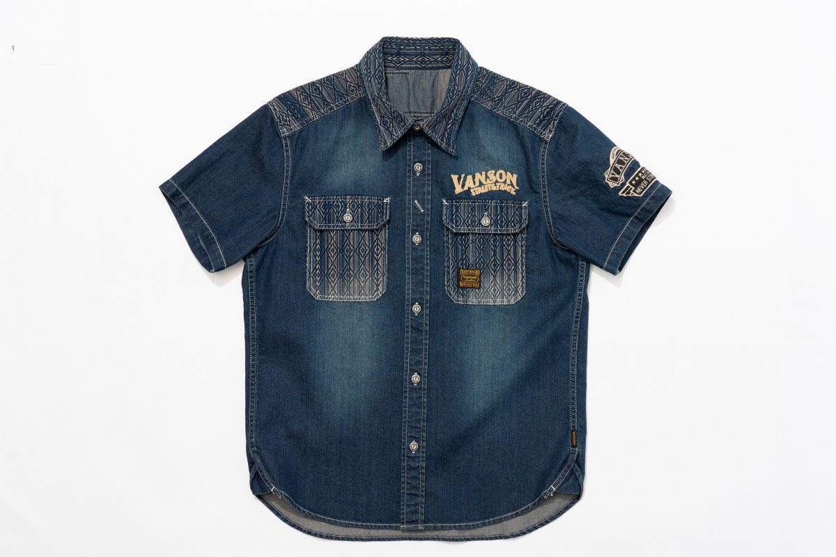 いい感じに着込んだ感じを演出したデニム生地にポケット、襟、バックヨーク部に雨絣り(あめがすり)刺し子で切り返した半袖シャツ。胸と背面のデザインはチェーン刺繍。袖にはワッペンがつく。1万3800円