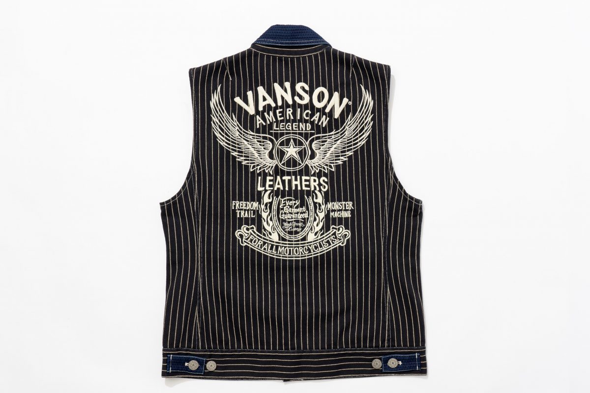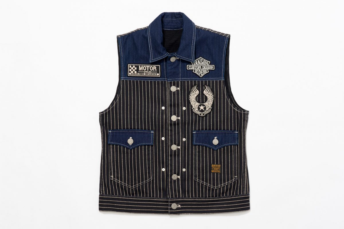 ウォバッシュをベースに襟と前面上部を刺し子で切り替えたベスト。左胸上部のワッペン、背面のロゴには蓄光刺繍が使われるなどバイカーのための安全面も考慮されている。1万4800円