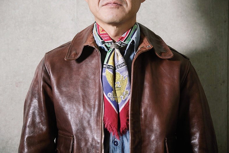 亀屋さんの着こなしの基本となるA-2×シャンブレーシャツ。普段着としてはOKだが、よそ行き感を出すのならちょっと色身が地味。そんな中、亀屋さんはA-2に合わせるスカーフやストールの巻き方を教えてくれた。