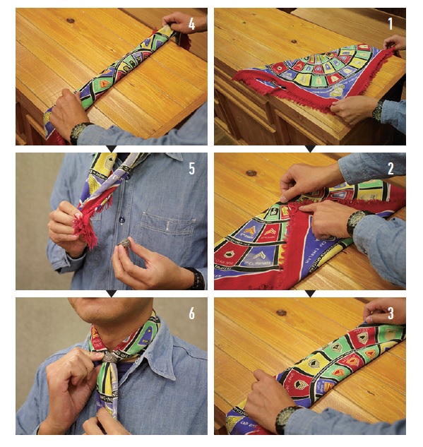 スカーフを首に巻き、リングをスカーフ留めにするのが亀屋流。昔のシアーズカタログでリング型スカーフ留めを見つけ、ヒントにした。