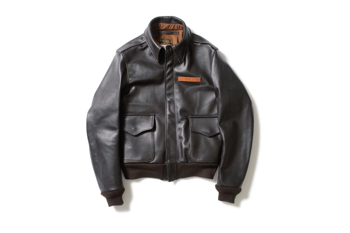 革本来の風合いが楽しめる「ネイキッドカウレザー」を採用したA-2。大戦中期の台襟付きモデルを細部に至るまでオリジナルを忠実に再現している。台襟付きのカラーに、大きめのフロントポケットなどメリハリのあるフォルム。左胸には型押の革製プレート。シンプルなデザインのA-2だけに、AVIREXロゴがよく映える。Made in U.S.A.。11万8800円(AVIREX 新宿 TEL03-5367-2013)