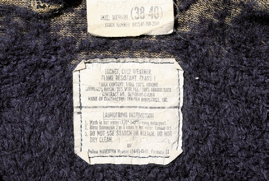 A-2デッキジャケットは’80年代終わりまで長期間使われたが、その後継モデルとして難燃性繊維であるアラミドノーメックスを使い、火災等に対応させたアラミドデッキジャケットが新たに登場。このアラミドジャケットの正式名称は「Jacket,Cold Weather, Flame Resistant, CLASS1」と呼ばれ、’90年から’96年までの短期間だけ採用されていた。