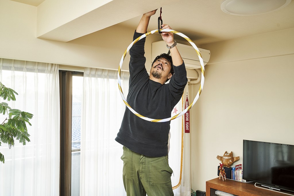 リビングの真ん中にフラフープを設置。家族も興味津々。ゴールフープ前の攻防を想定練習!