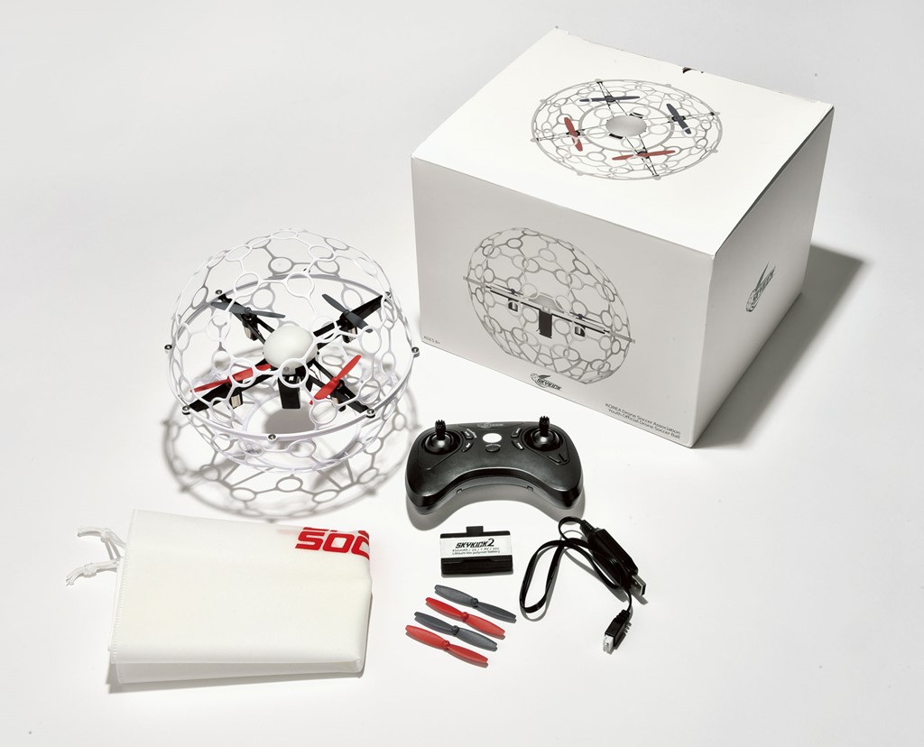 早速練習用にゲットしたのが、こちらドローンサッカーで使われるドローンボールの小型版『スカイキック』。サイズは約20センチという小型サイズだが、6軸ジャイロやオートホバリング、そして3段階のスピード調整も可能な優れもの。ワンボタンで離陸と着陸もできるので、まったくの初心者でも扱えるイージーさ。これなら自宅でぶつけることなくドローンサッカーの練習ができる!