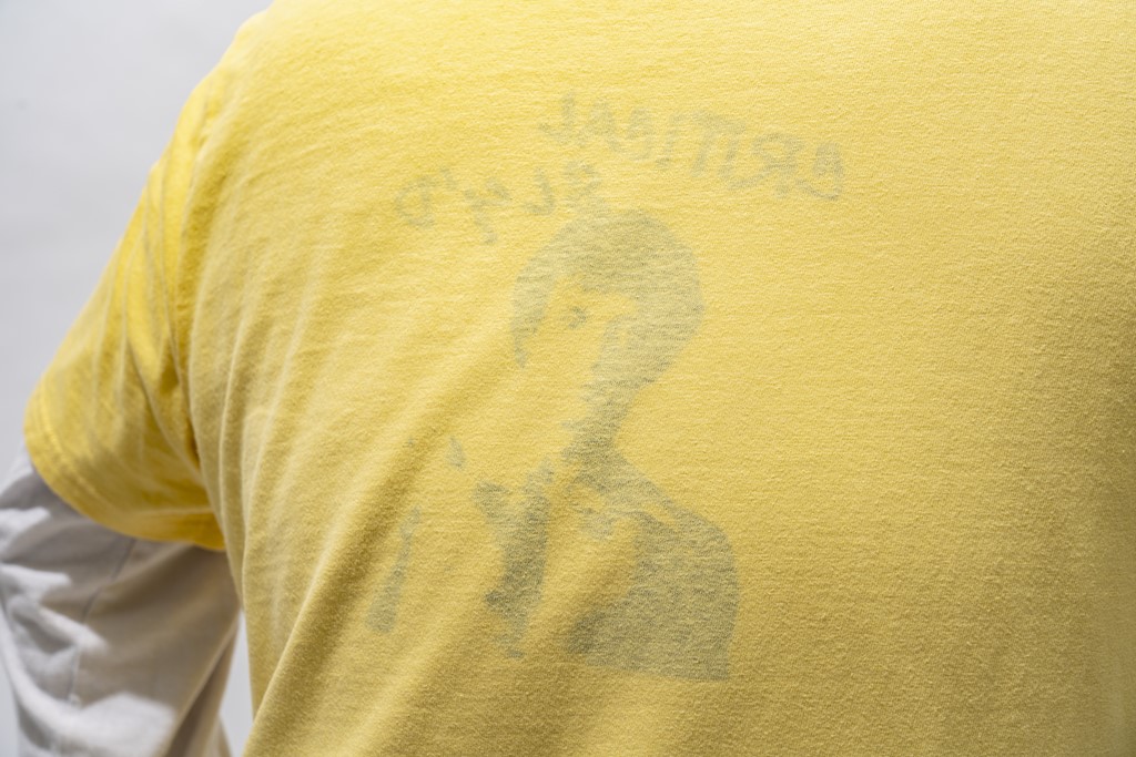 こちらは背中。うっすら何かが見える。これ、ボディの内側にプリントしているので、バックサイドにはうっすらとロッキー・バルボアの姿が浮かび上がるという趣向。フロントのプリントがMr.Tという非常に濃い口なので、バックサイドはあっさり目と、デザインバランスに好感が持てる。