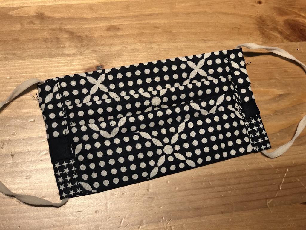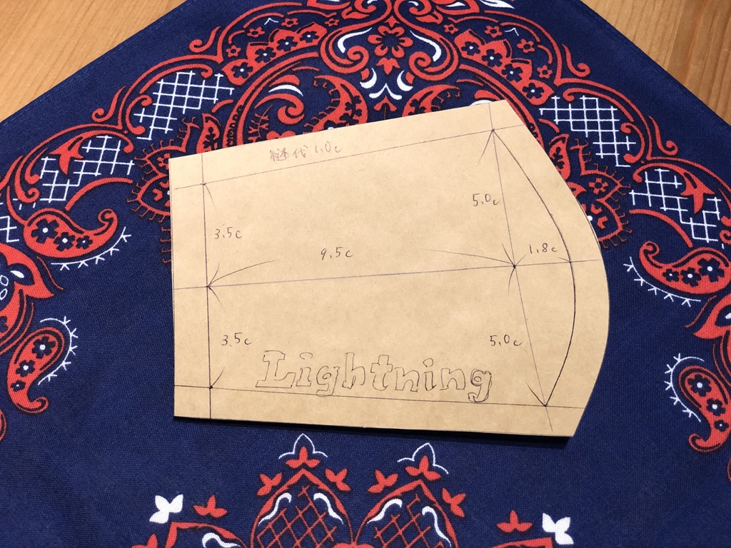 そこで、今回、ライトニングオリジナルの2つのバンダナを使い、2種類のマスクを作ることに。1つ目は立体的なタイプで、2つ目はマスク中央にプリーツが入るタイプ。どちらも型紙を作ったが、手芸店「okadaya」などのサイトから無料でダウンロードできるので、そういうのを活用するといいだろう。