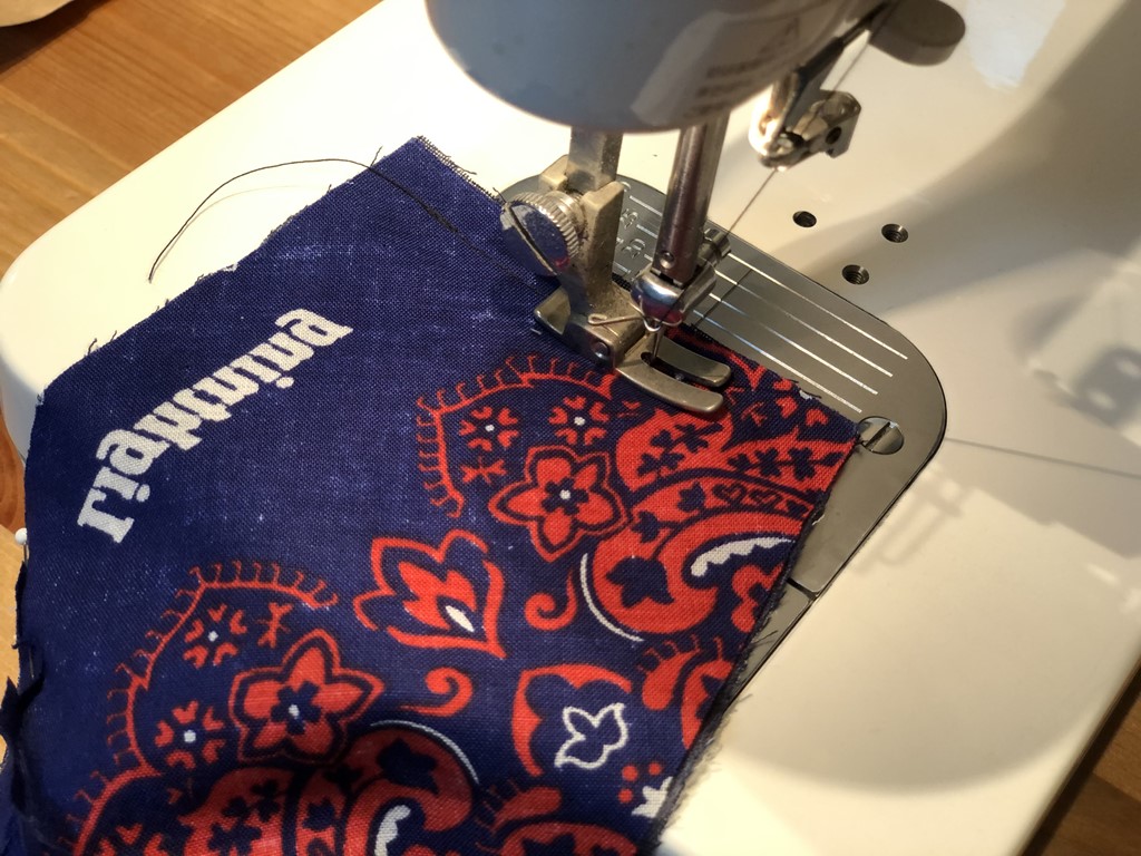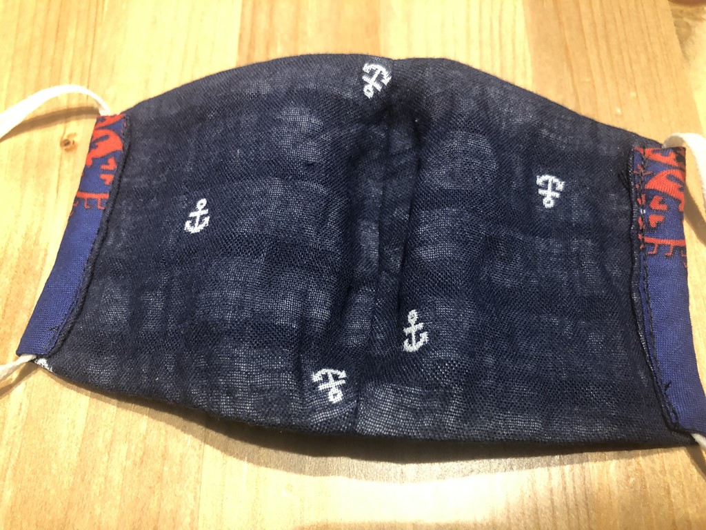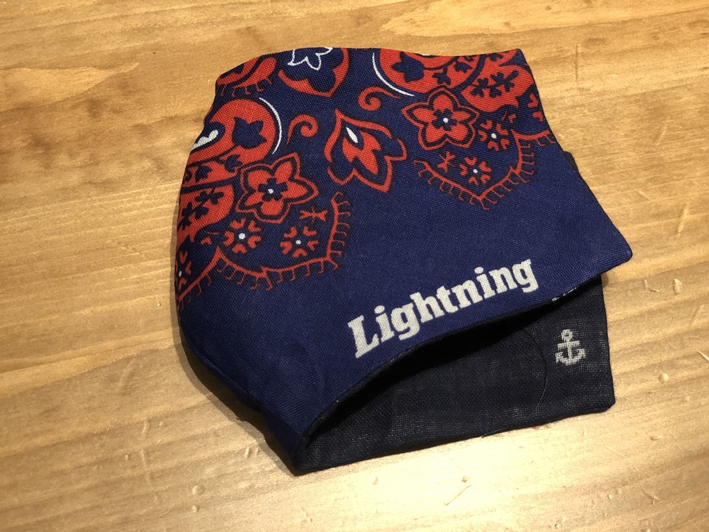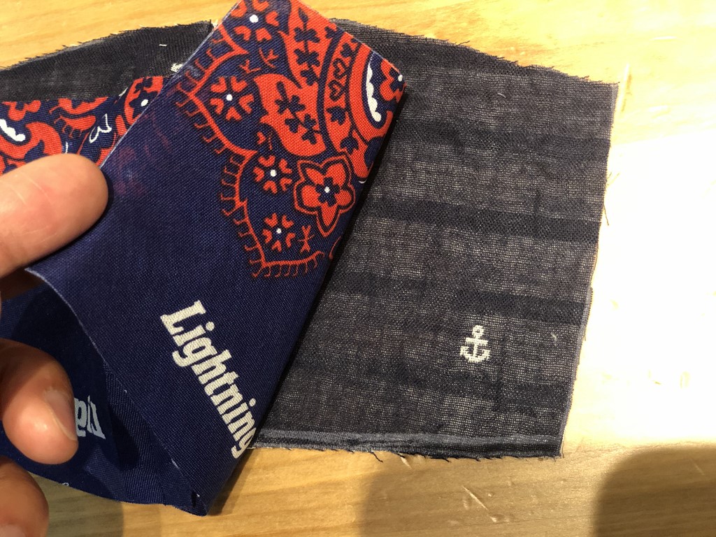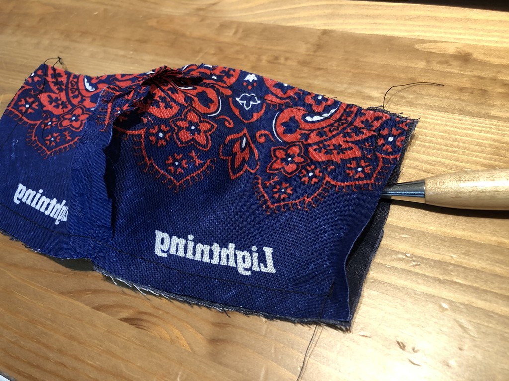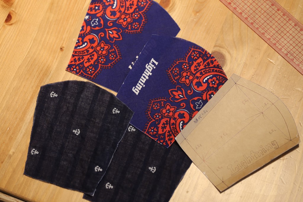 1つ目に作るのは、立体的なタイプのもの。表地がウエアハウス製のライトニングのバンダナで、裏地に錨刺繍入りのガーゼ生地を使用している。