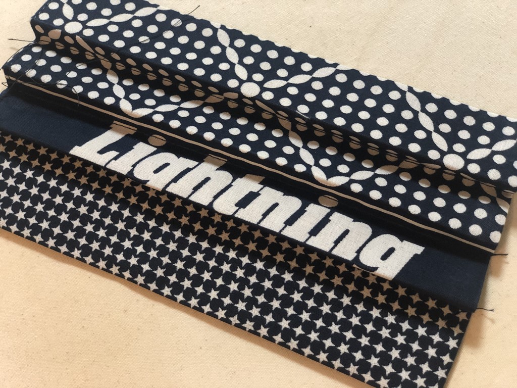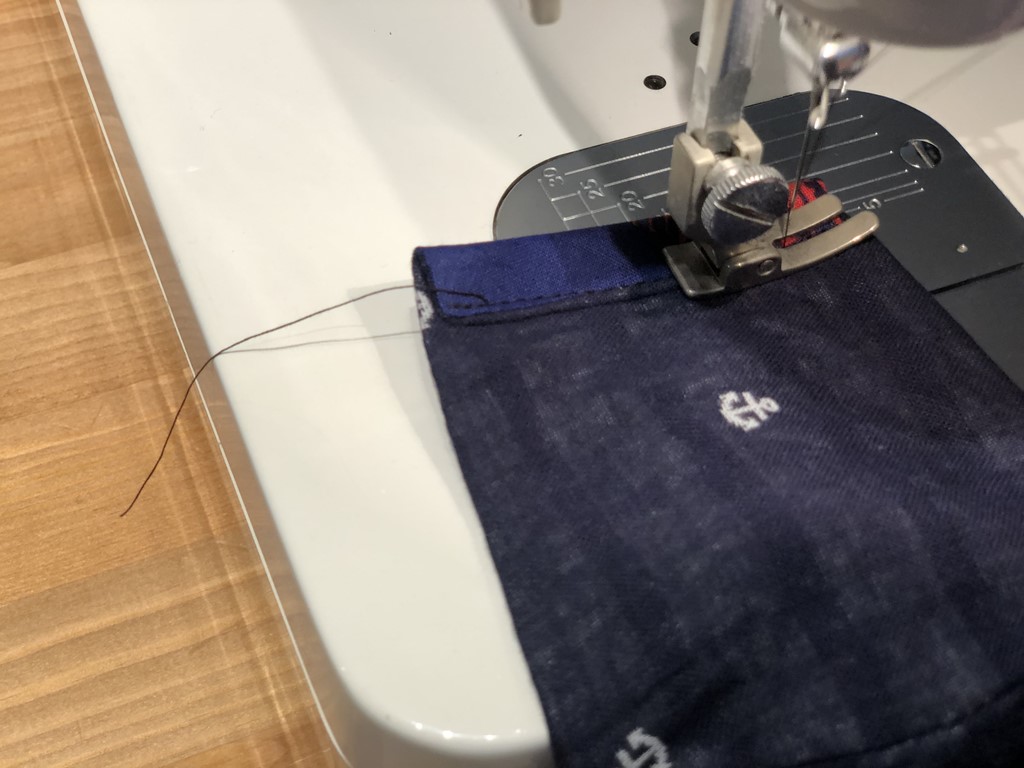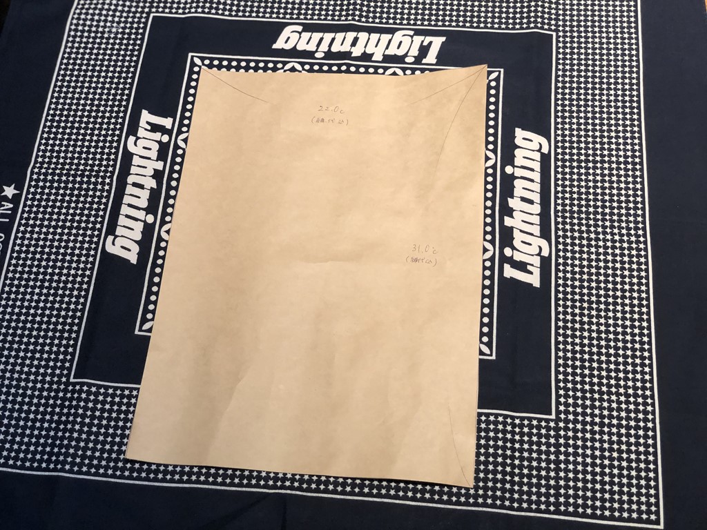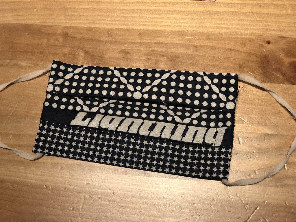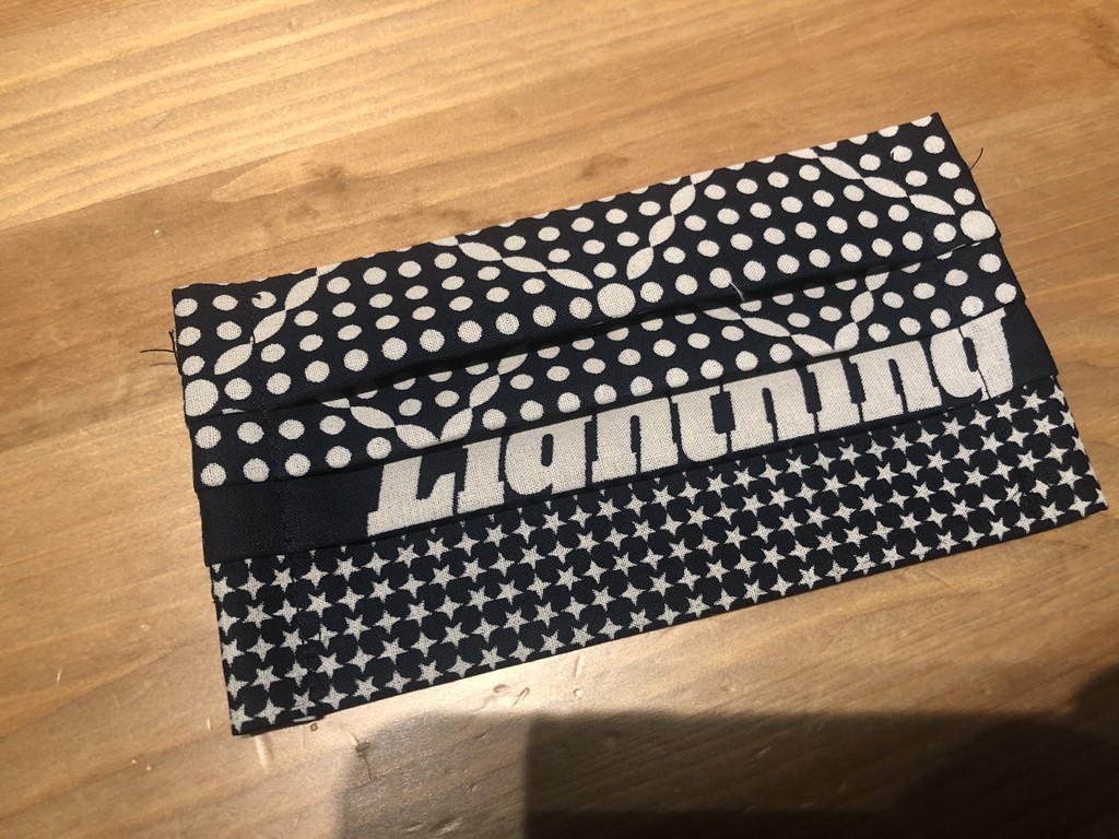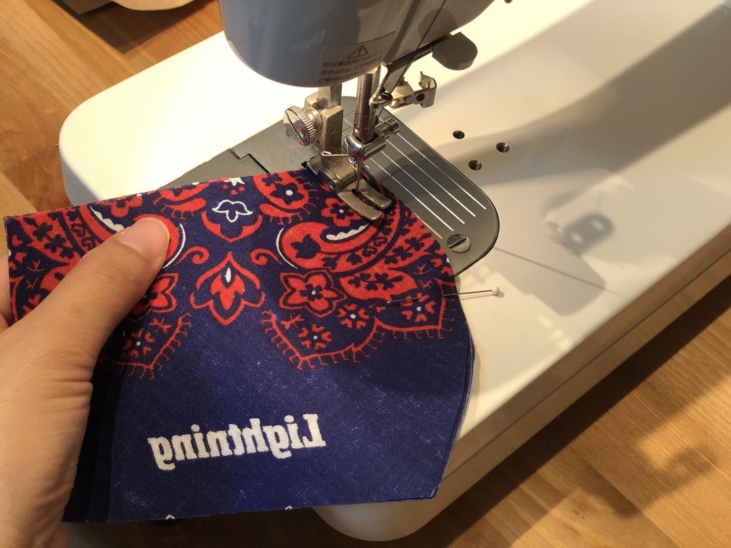 1つ目に作るのは、立体的なタイプのもの。表地がウエアハウス製のライトニングのバンダナで、裏地に錨刺繍入りのガーゼ生地を使用している。