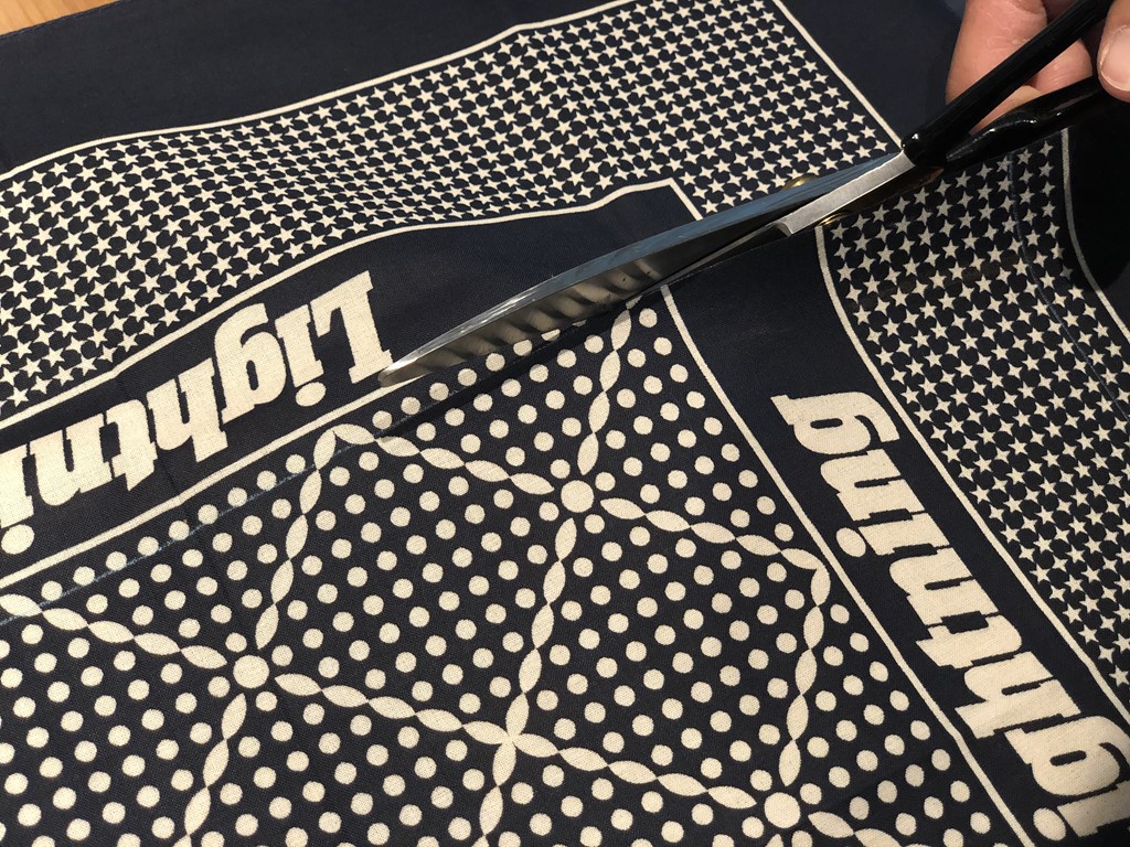 裁断する場所が決まったら、チャコで印を付けて裁ちばさみでカット。このバンダナは肉厚で裁断しやすいが、柔らかいガーゼ素材などはずれやすいため、慎重に行ってほしい。