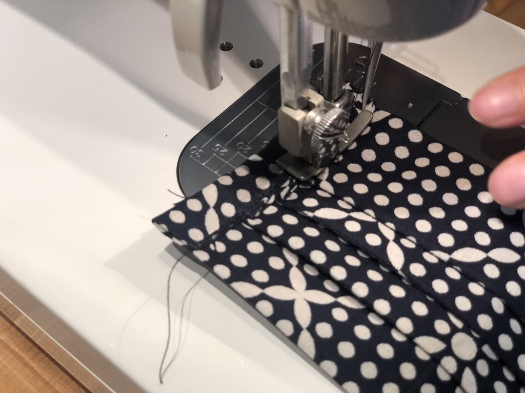 次に両サイドの紐を通す部分を縫製。プリーツがよれないように気を付けよう。