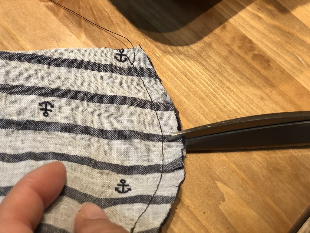 縫い合わせたら、部分に裏からはさみを入れてヒダ状にする。これは表地と裏地を合わせる際に干渉しないようにするため。裏地だけでなく表地も同じように切り込みを入れる。