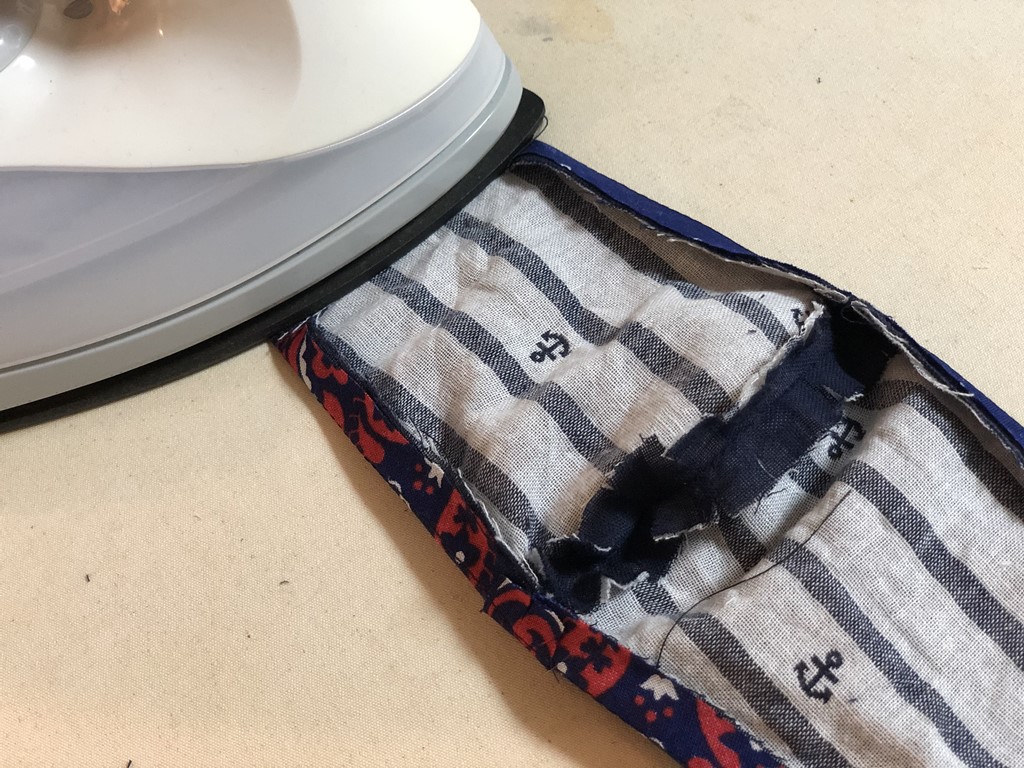 縫い代にしっかりアイロンを当てて本縫いした後、開けておいた片方のサイド部分から生地を裏返す。完成形が見えてきた。
