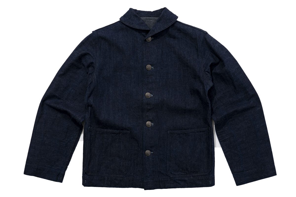 米海軍が1930年代後半から甲板作業員らに支給したライトオンスデニムのショールカラージャケット。アンカーマーク入りのチェンジボタンはじめ、内側に施されたステンシルまで完全再現。3万5200円(ウエアハウス TEL03-5489-7889)