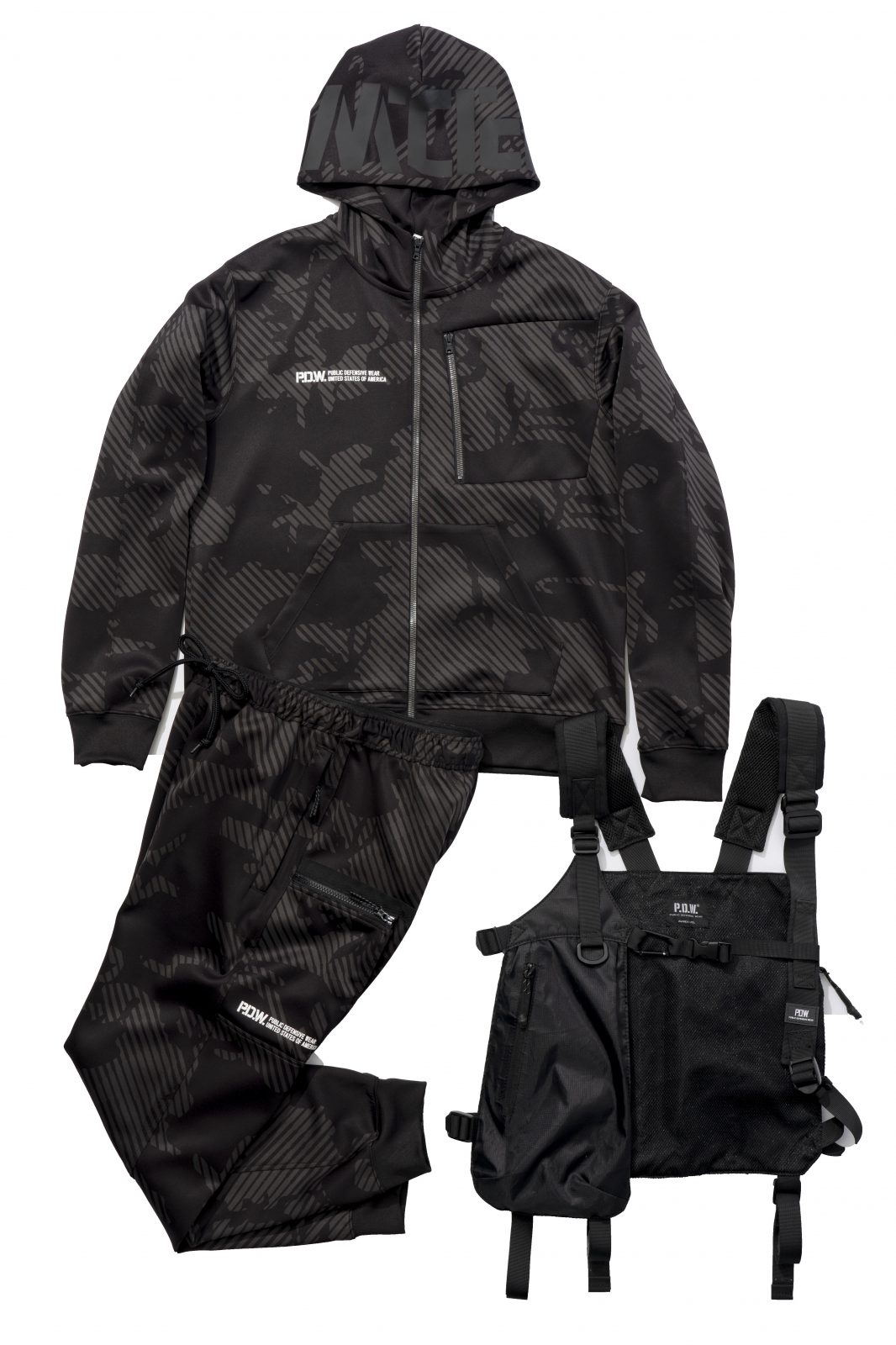 フライトジャケットの名コントラクターとしても知られるアヴィレックスがS.W.A.T.や軍特殊部隊などからインスピレーションを受けた、ブラックベースのハイパフォーマンスカジュアルラインであるP.D.W.(パブリックディフェンシブ ウェア)の新作。