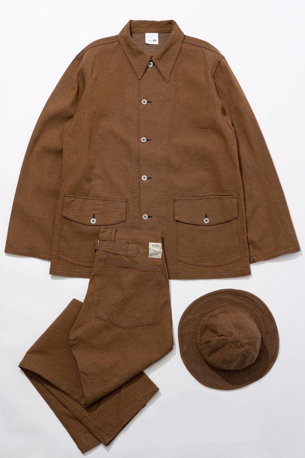 ブルーデニム生地が制式採用された1919年以前に米陸軍で用いられていたブラウンデニム生地を再現。経糸に硫化染料のブラウン糸、緯糸には生成りとブラックの撚り糸を使用し、当時主流だったプルオーバーではなく’40sタイプのワークジャケットにアレンジしている。