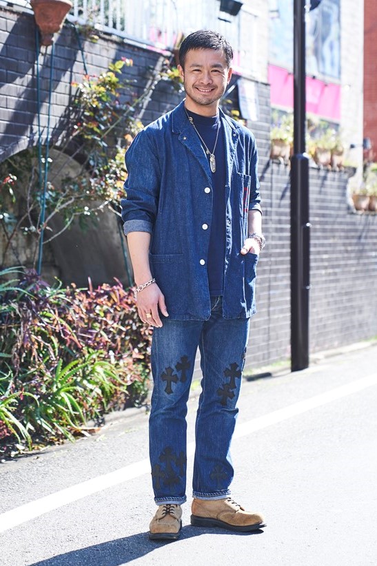 もちろんジージャンとジーンズのセットアップは大好きな組み合わせであるが、レッド・ウィングのスーパーソールを合わせると当時のままなので、デニムのラペルドジャケットで違いを出した。デニムはクロムハーツがヴィンテージの501にカスタムしたもの。