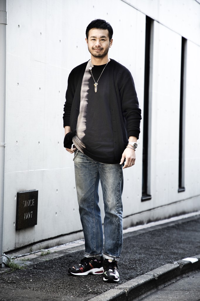 昨年より気に入って履いているスニーカーのひとつが親交のあるアトモスが別注したエアマックス スクエアライト。ニットカーディガンにジーンズという落ち着いたスタイルなので、これくらいパンチの効いた足元にしてもうまくバランスが取れることを教えてくれた。