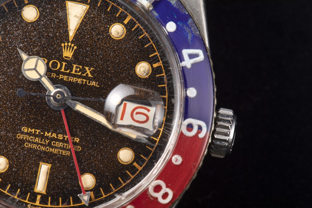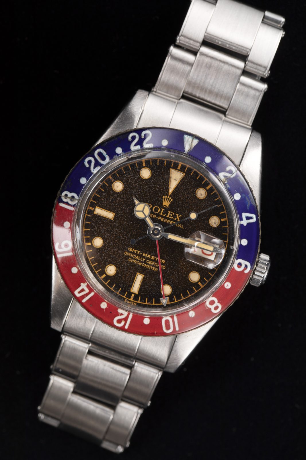 1955年にリリースされ、今も続くロレックス唯一のパイロットウォッチであるGMTマスター。当時のアメリカ最大手航空会社であったパンアメリカン航空からの依頼で開発され、24時間計と24時間目盛り入ベゼルインサートを備えた回転ベゼルによって、ローカルタイムと別のタイムゾーンの時刻が表示できる画期的な機構を装備した。1955年のリリースとともに同社で正式採用された。この個体は初期モデルのRef.6542である。449万8000円(クラウンマニアックス トウキョウ TEL03-6260-9913)