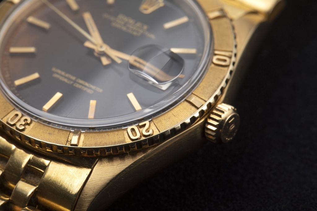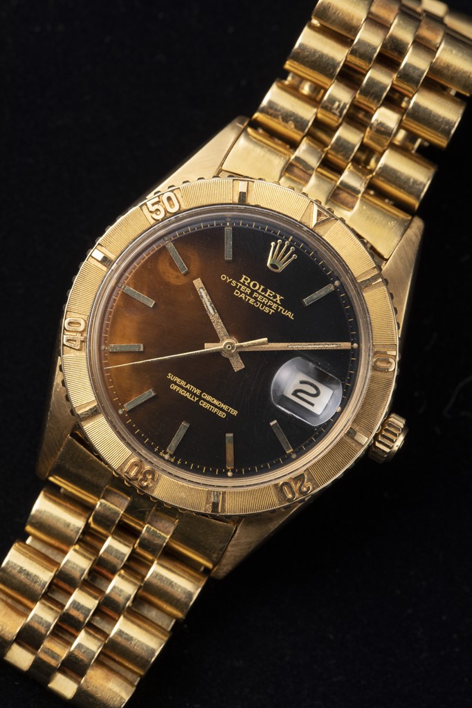 現在は廃盤になってしまったが、2000年代までラインナップされていたデイトジャストシリーズの通称サンダーバード。これはアメリカ空軍のアクロバティックチームである『サンダーバーズ』の隊長ドン・フェリスの引退を記念して、回転ベゼルを搭載したデイトジャストをオーダーしたことが始まりだと言われている。専用のリファレンスを振り与えられたが、サンダーバードとはあくまでニックネーム。こちらは第3世代のRef.1625で、希少な金無垢のミラー黒文字盤。300万円(クラウンマニアックス)