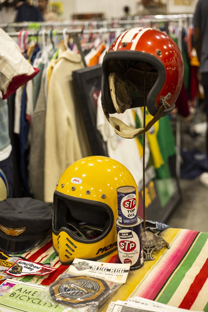 服だけでなくヘルメットなど雑貨も多く販売しているのが、このイベントのいいところ。BELLのMOTO3 は175ドルで販売。安い!