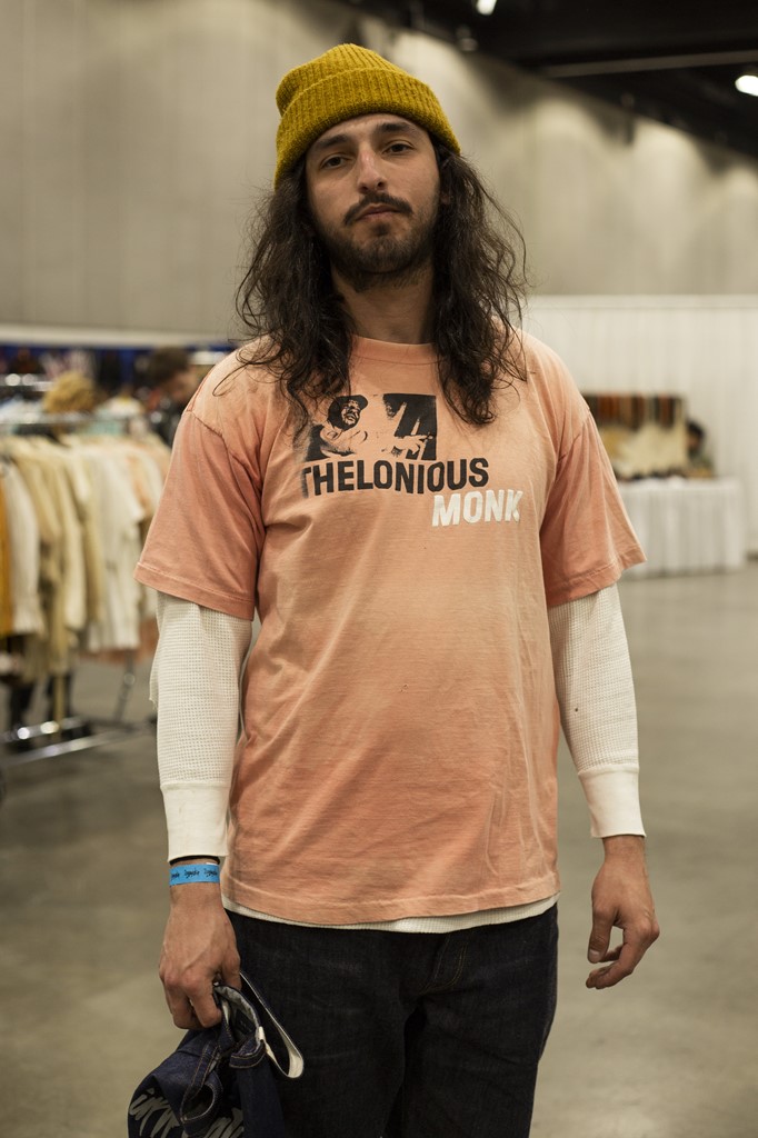古着ディーラーのネイトさんは、褪色したTシャツをサラリと着こなすナイスガイ。プリントはジャズ・ピアニストのセロニアス・モンク。
