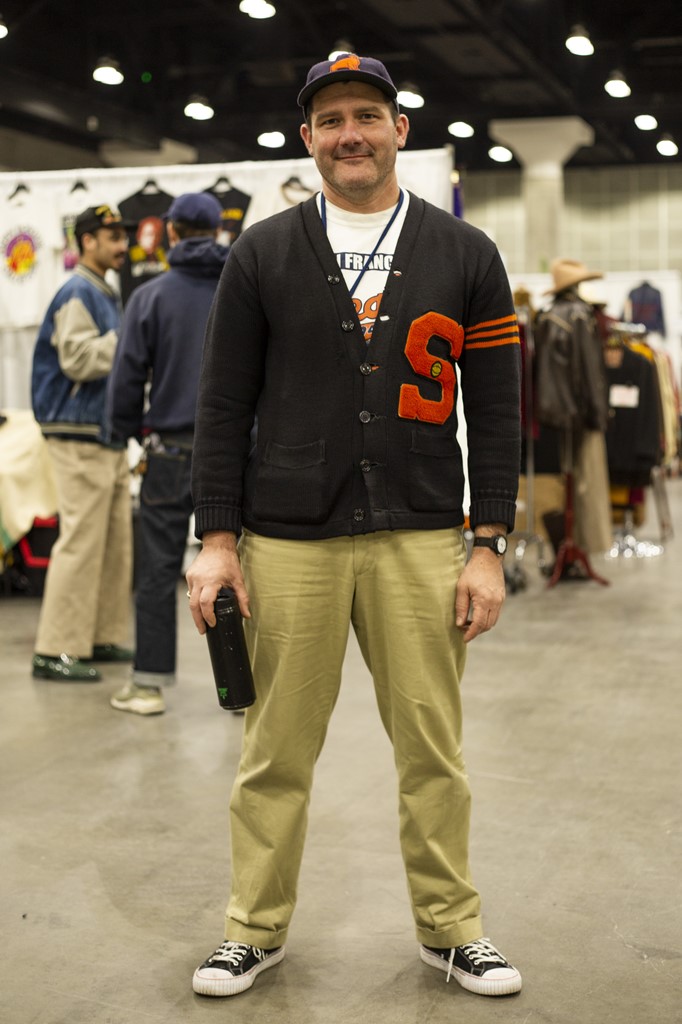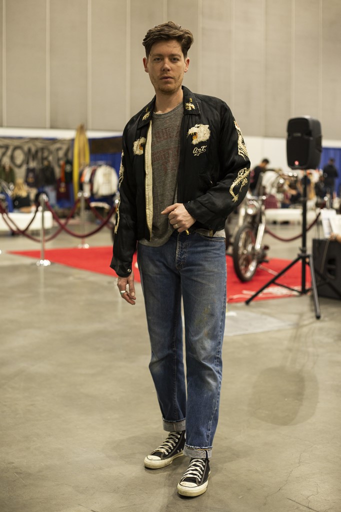 スカジャンにジーンズ、Tシャツと全身ヴィンテージで固めたポールさん。身に付けているアイテムすべてが、欲しいものだらけ!