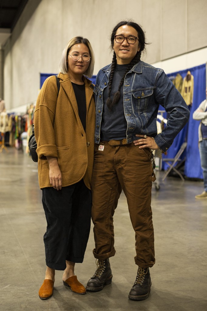 Leeのジャケットにカーハートのダブルニーを合わせたブライアンさんと彼女のキャンディスさん。三編みのヘアスタイルもクールすぎる。