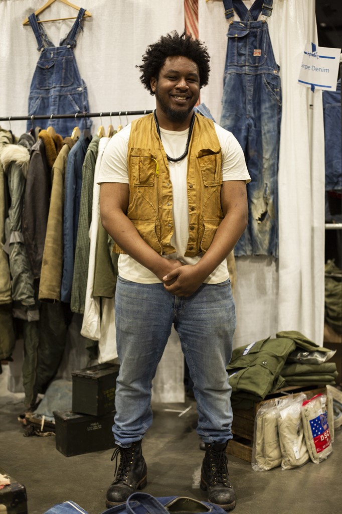 ヴィンテージショップBlue Collar Collectiveのエヴァンさん。ヴィンテージのハンティングベストで着こなしにアクセントをプラス。