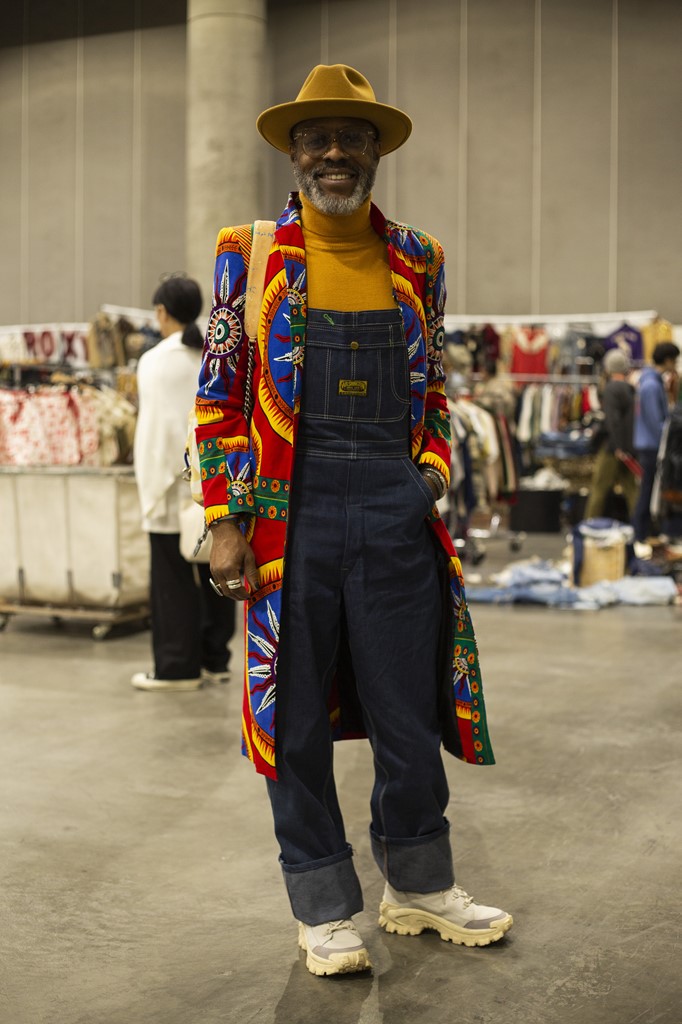 ド派手なコートに、ワシントンDEECEEのオーバーオールを合わせたマイケルさん。上級テクニック満載の完璧な色使いに脱帽!
