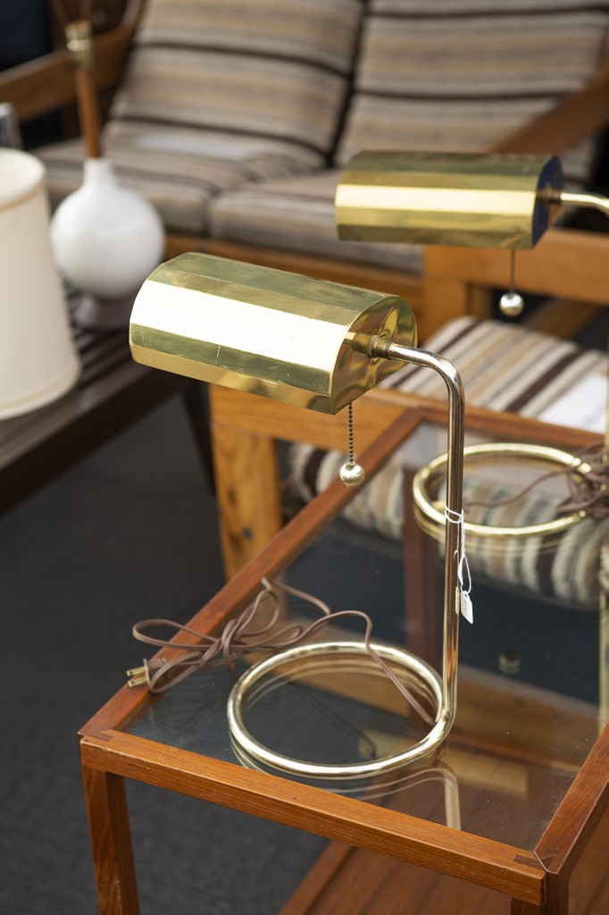 シンプルだけどアメリカらしいデザインが漂うゴールドのデスクランプ。奥にも同じデザインがあるため、何はともあれ二個買っておきたい。寝室のナイトスタンドとしても使えそう。各75ドル。