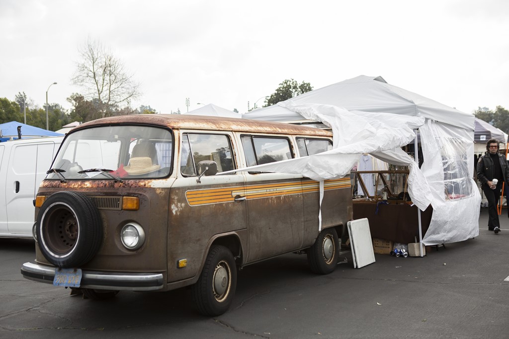 出店ブース裏に停めてある珍しいクルマをチェックするのもローズボウルの楽しみ方。この日見つけたユニークなクルマBest1は錆びだらけのレイトバス。’70sなデカールがナイス!