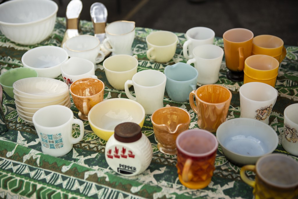 ファイヤーキングを筆頭にミルクガラスのヴィンテージテーブルウエアがズラリ。アメリカのフリマではお馴染みの光景だ。