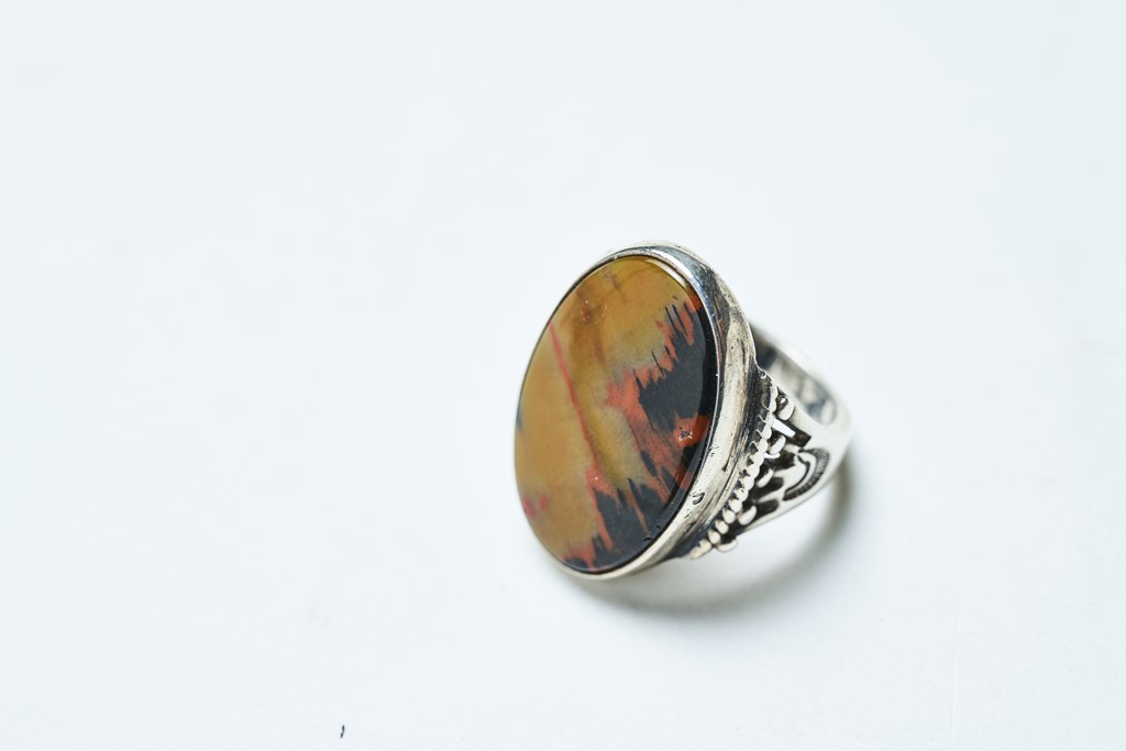 太古の植物の化石であるペトリファイドウッドを使ったリング。氏の作品が売られているのは稀である。58万8000円