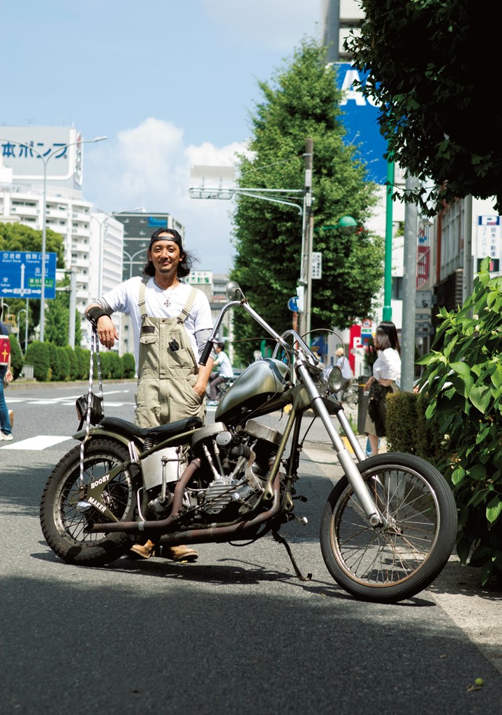 1970年代のニューヨークのチョッパーをコンセプトにリスキービジネスで製作した1台。プレートをモールディングしたフレームのアクスル周りの作りや、Love Ear Art によるフリーハンドのフレイムスが時代感を再現している。ミッド幅のトリプルツリーにセットした8インチオーバーの41㎜フォークも当時らしいチョッパーのディテールだ。ロンTとTシャツのレイヤードにサロペットを合わせる抜け感のあるコーデがチョッパーと絶妙なバランスで決まってる。
