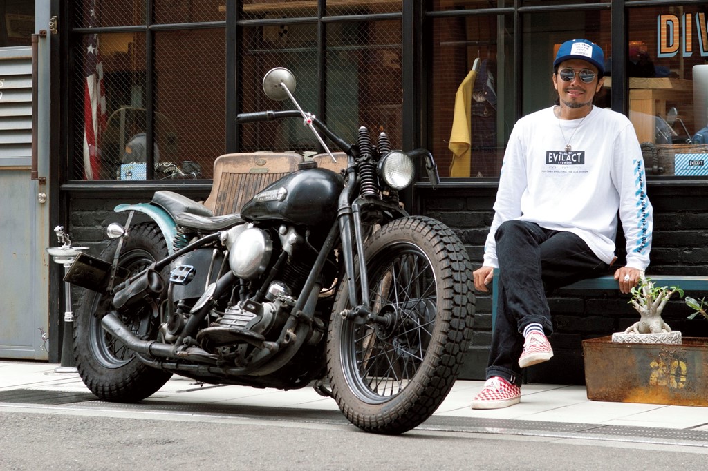 元々オリジナルに近いスタイルで乗っていたナックルヘッドだが、千里浜サンドフラッツに参戦するためにボバースタイルにカスタム。普段乗りでも使うため最低限のパーツ構成で軽量化。タンクと色が異なるフェンダーがガレージビルドのバイクのようなラフな雰囲気を演出する。シート&ピリオンパッドはGood Speed Equipment、ツールバッグはEVILACTのオリジナル。ロンTにブラックデニム、チェッカー柄のスニーカーを合わせたストリートな着こなしがバイクにぴったり。